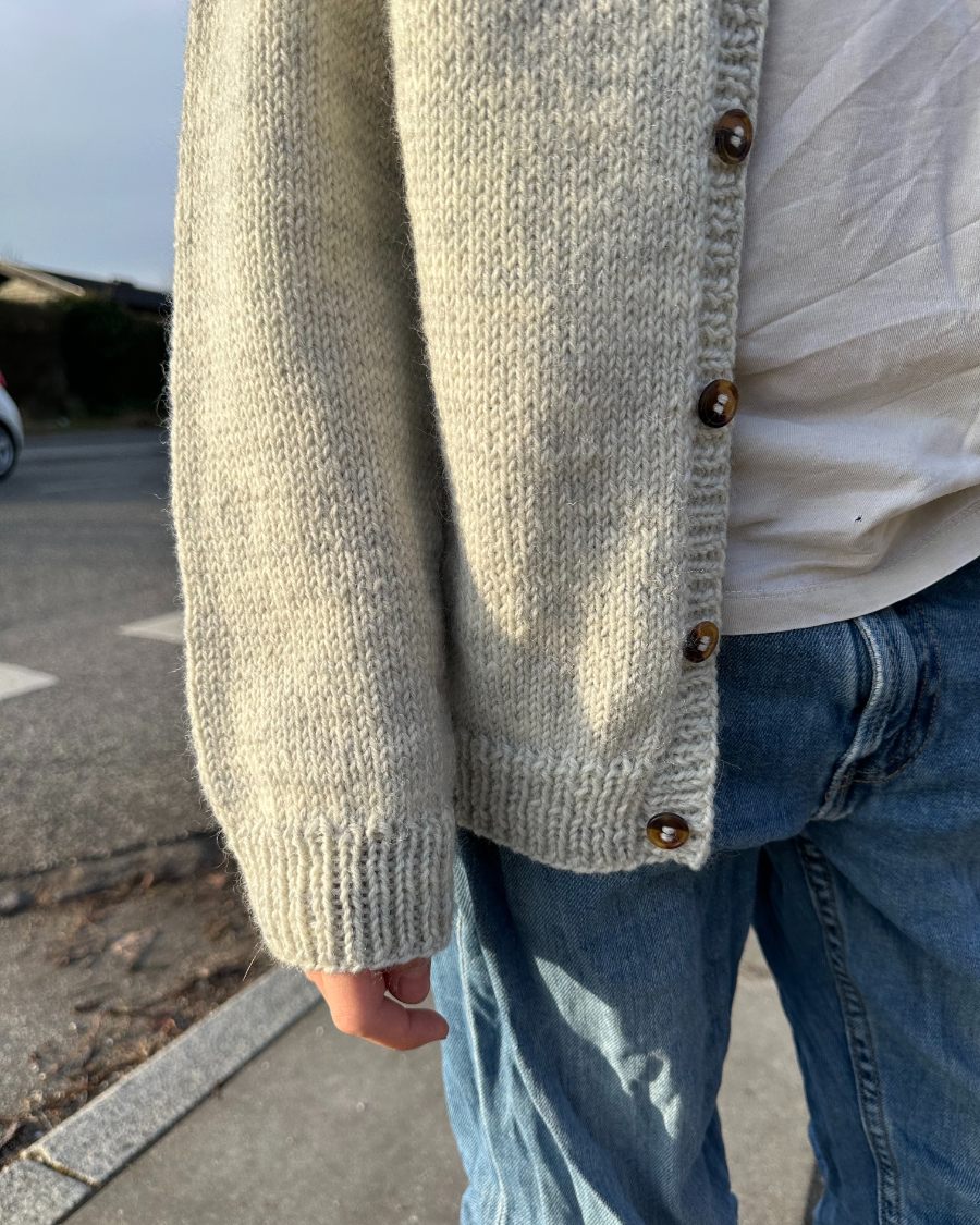 Den grå Ankers Jakke er strikket i Peer Gynt fra Sandnes Garn i farven Ash melange [1021].