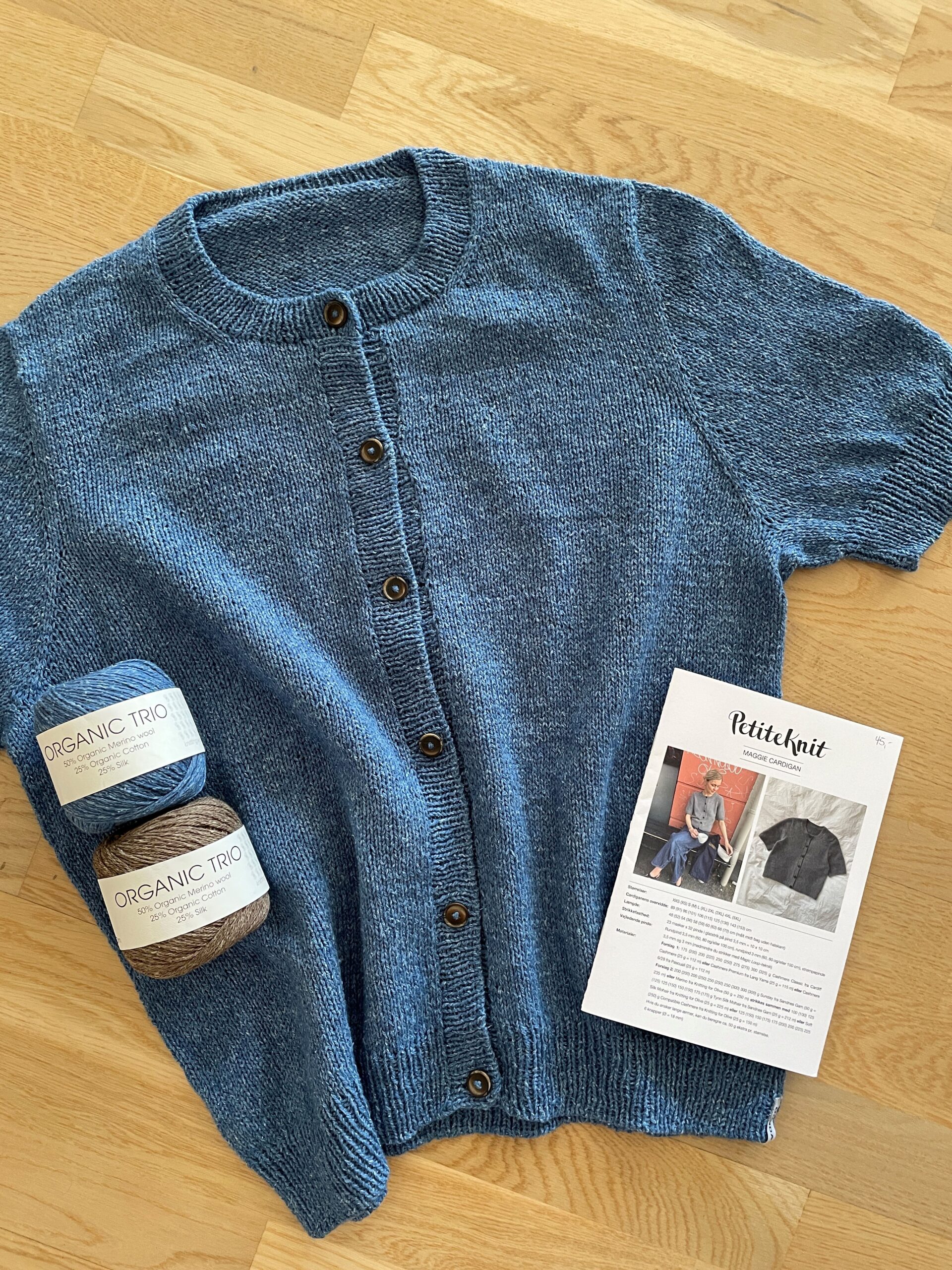 Jeg har strikket cardiganen i Organic Trio fra Hjertegarn. Den er blevet super let og lækker. Jeg har strikket i én tråd og brugt 5 ngl. til str. L.